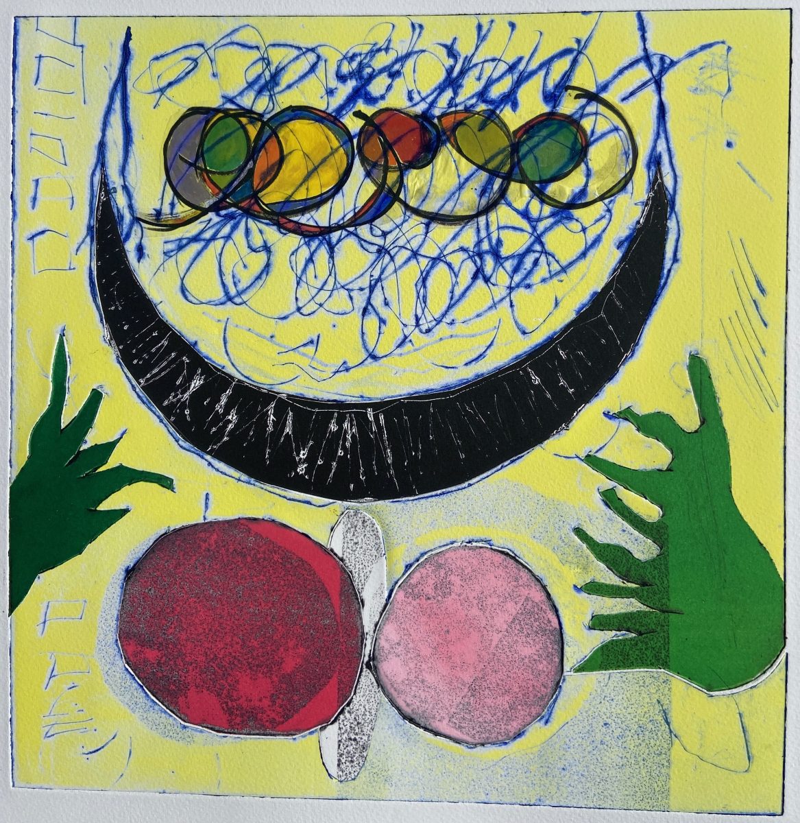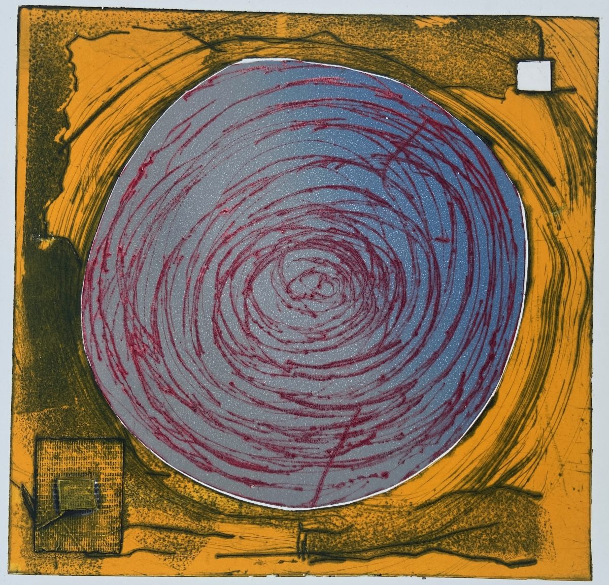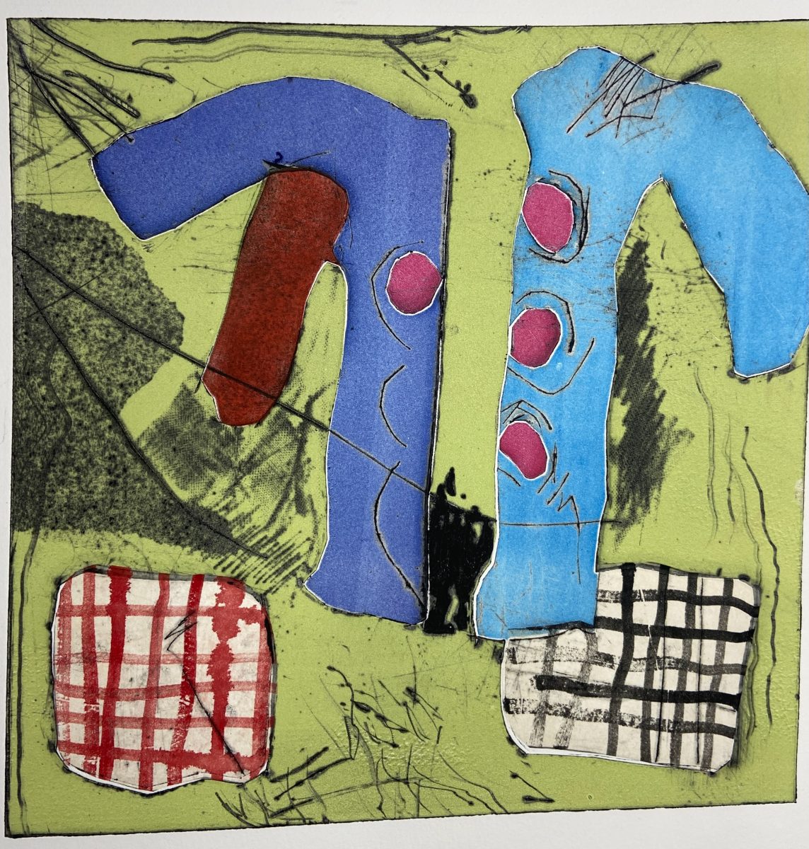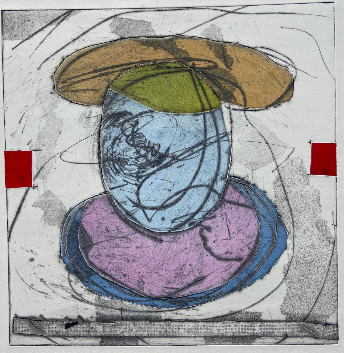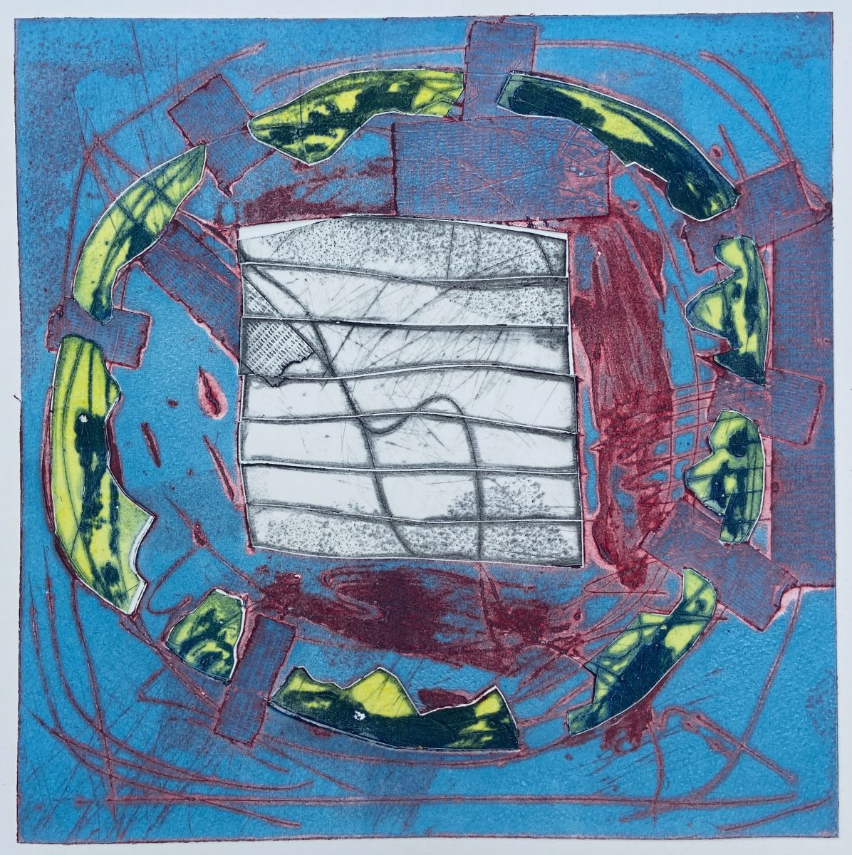 Simon makes drypoint prints that incorporate intaglio and relief printing and chine collé. He works with a flexible plastic material as his plate - cutting, scoring and engraving the surface - sometimes adding tape and textured paste to build up contrast. His prints are made in a variable edition of only five - which means for each design he makes five variations of colour, each print is unique.