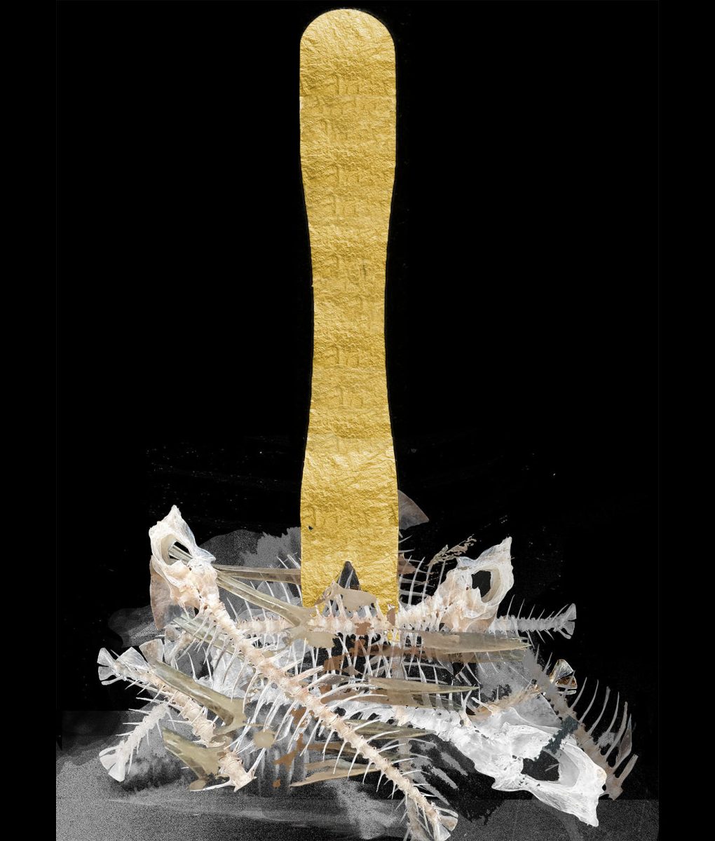Since 2020 I have pursued this new direction with the intention to establish my new artistic identity. I have been exploring the complex relationship between human consumption and the health of the oceans, creating juxtapositions between marine life, tools for consumption and well-known, iconic imagery, taking a slanted, entangled and sometimes humorous view. My intention is to ask people to think about how we exist as a part of a living planetary system and how the environmental damage we create through our traditions and practices means damage to ourselves.